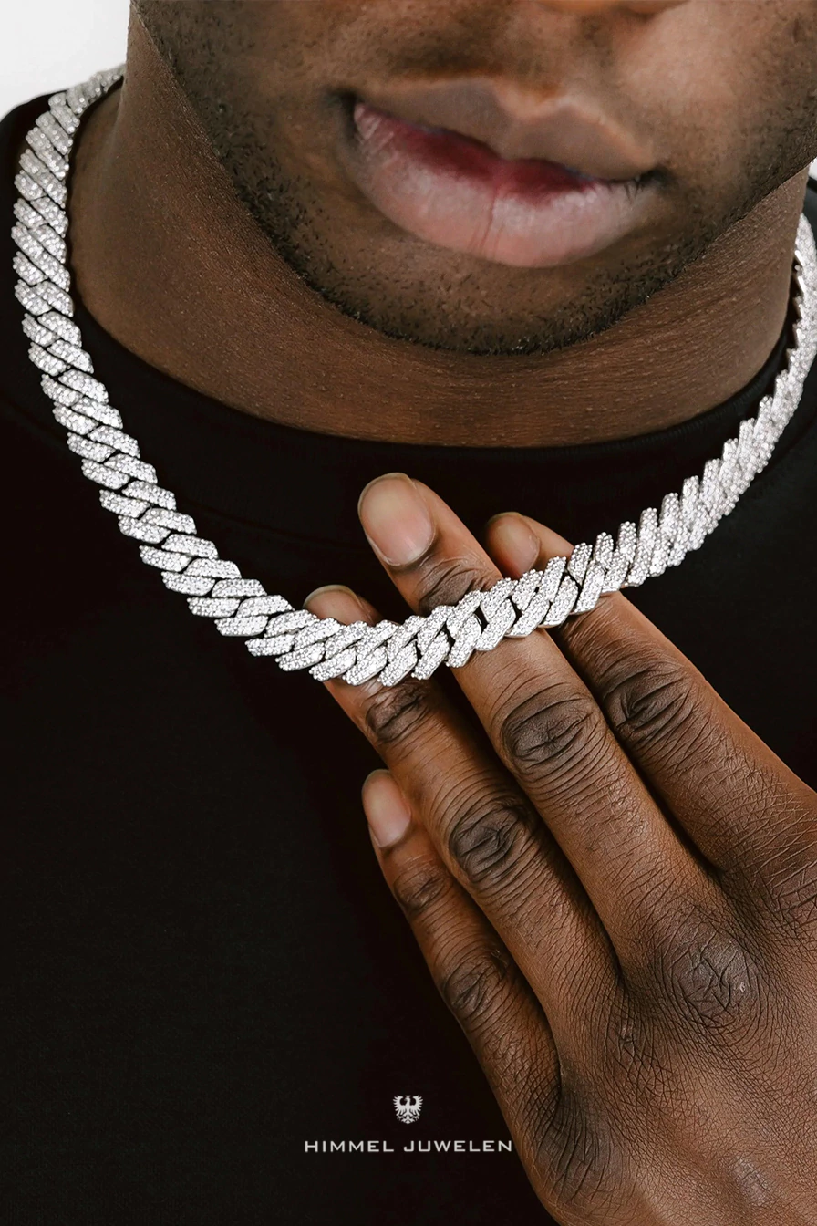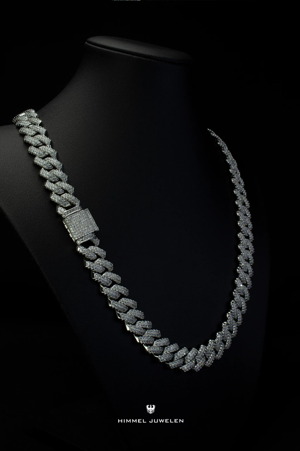 La cadena Miami Ice Artesanal es una pieza que irradia lujo y carácter. Cada eslabón ancho presenta un impecable trabajo artesanal, completamente cubierto de cristales A5 engarzados con precisión, creando un efecto de brillo continuo y deslumbrante desde cualquier ángulo. Su estructura sólida y su cierre robusto transmiten presencia y exclusividad, mientras que el acabado en oro blanco resalta un estilo sofisticado, ideal para quienes buscan destacar con elegancia y personalidad.