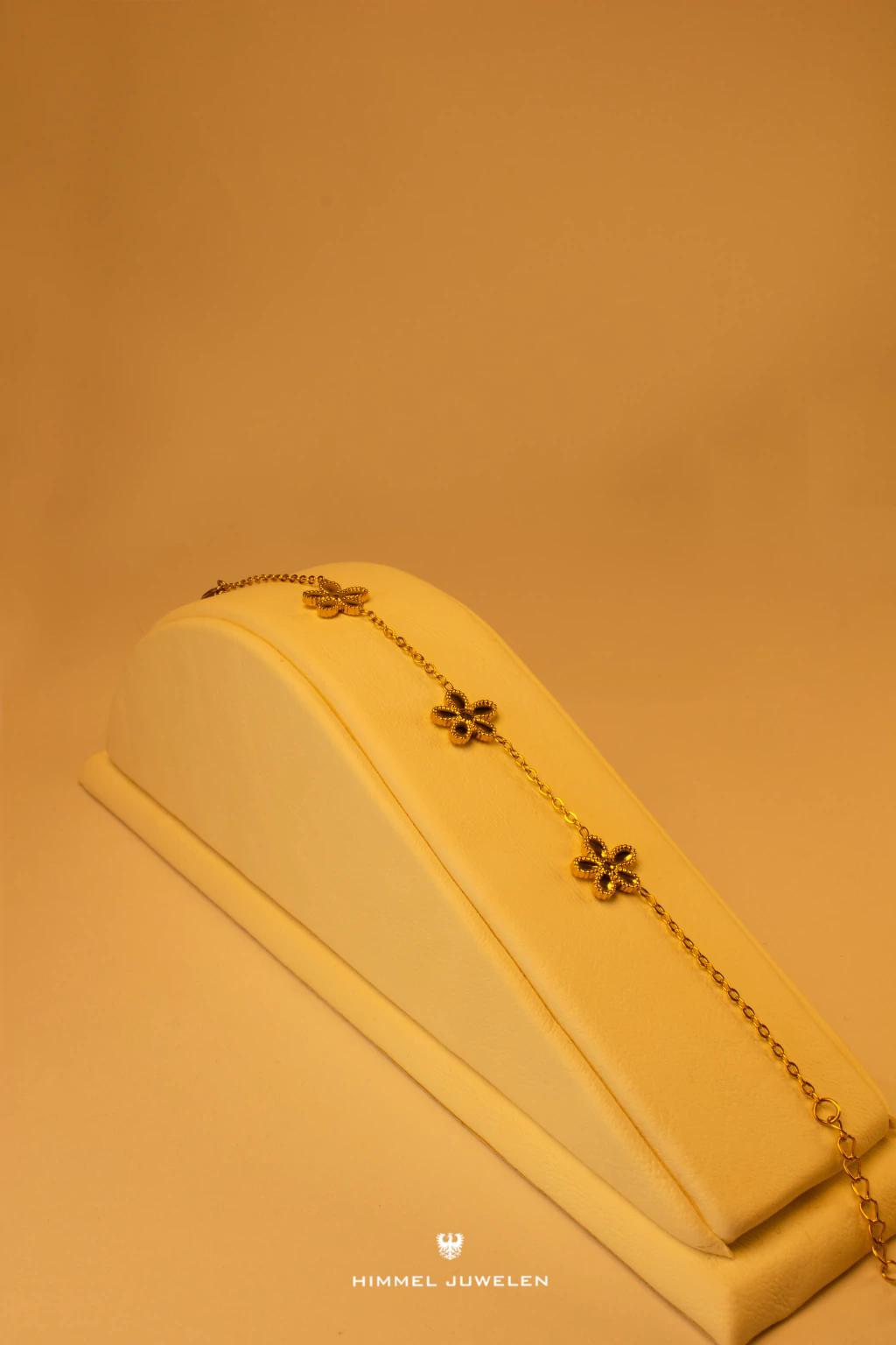 La pulsera Florea enchapada en oro combina elegancia y brillo en un diseño inspirado en la naturaleza. Sus delicados tréboles dorados reflejan la luz con sutileza, aportando un toque de sofisticación. Ideal para elevar cualquier look con estilo y una distinción que perdura.