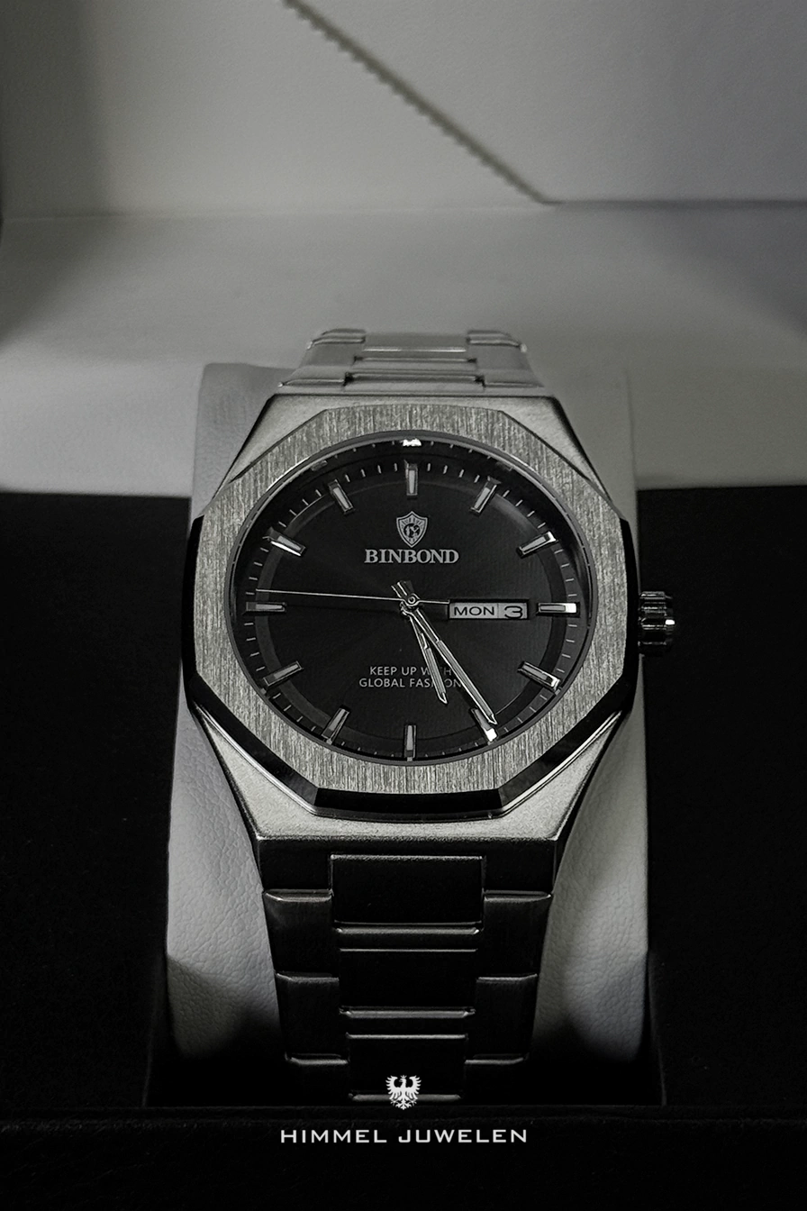 El Silver Hour es la fusión definitiva entre precisión suiza y diseño contemporáneo. Su caja de acero inoxidable con acabado plateado envuelve un dial negro elegante que resalta la fuerza de sus líneas geométricas, proyectando carácter y sofisticación en cada detalle. Un reloj pensado para hombres que valoran la distinción, la confiabilidad y el lujo atemporal.